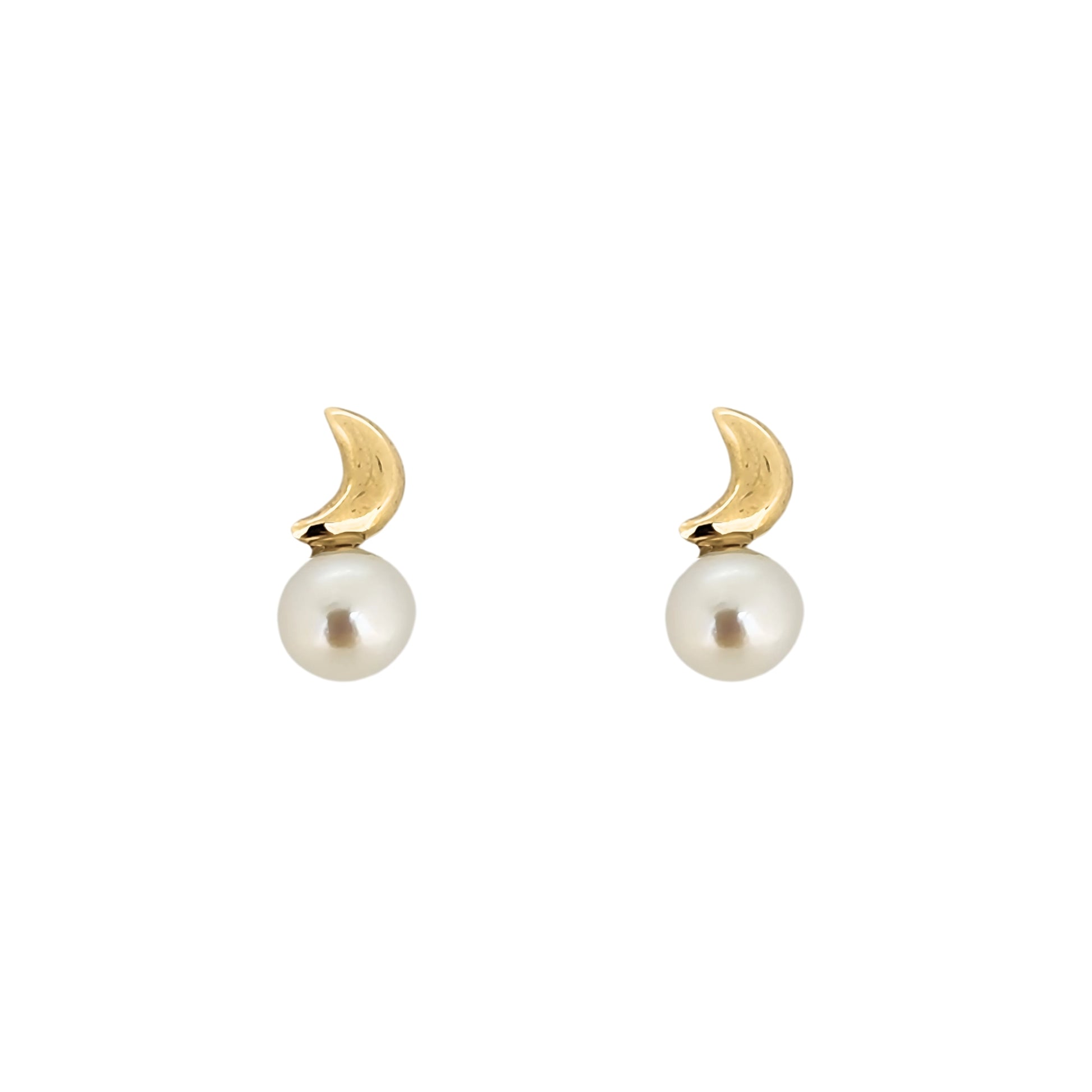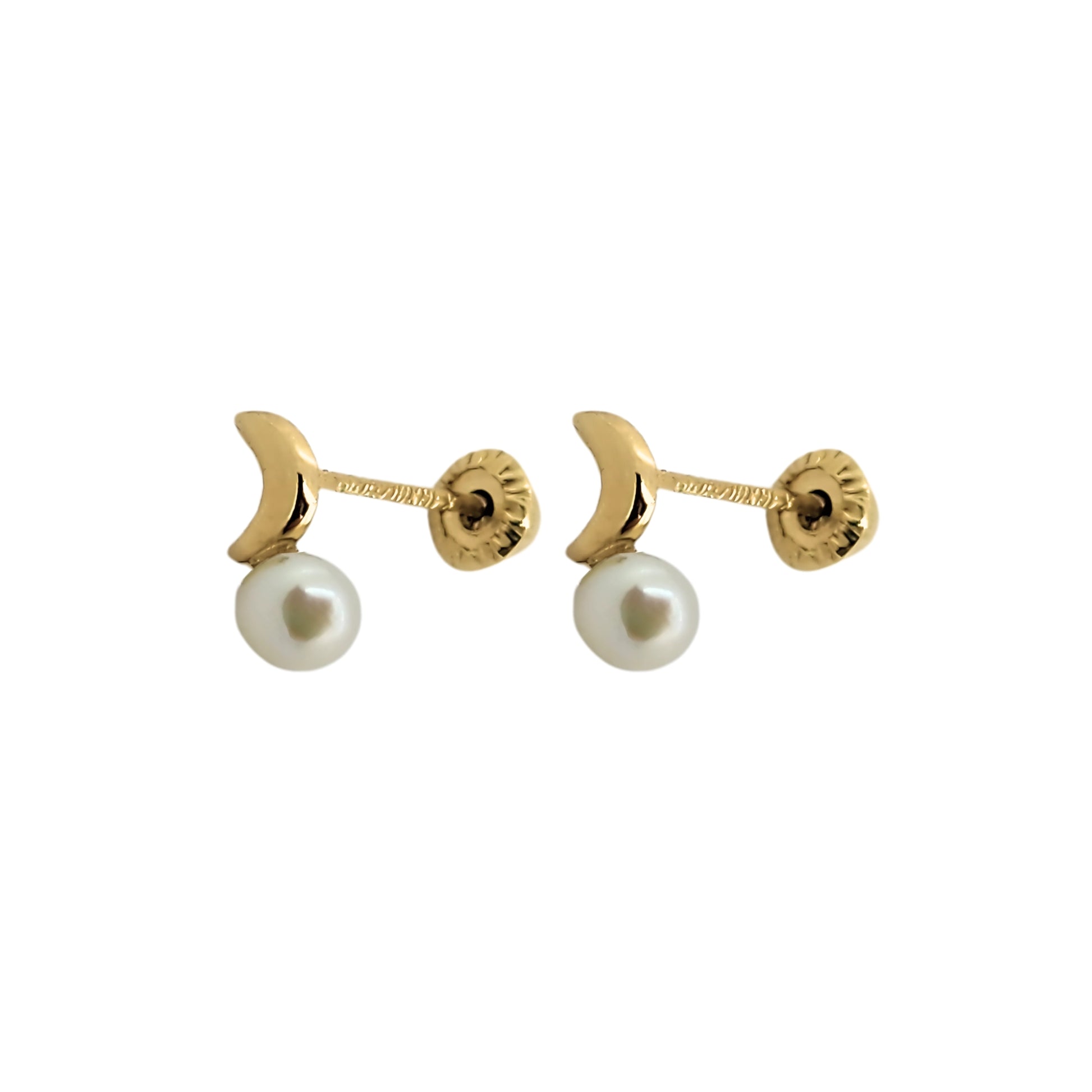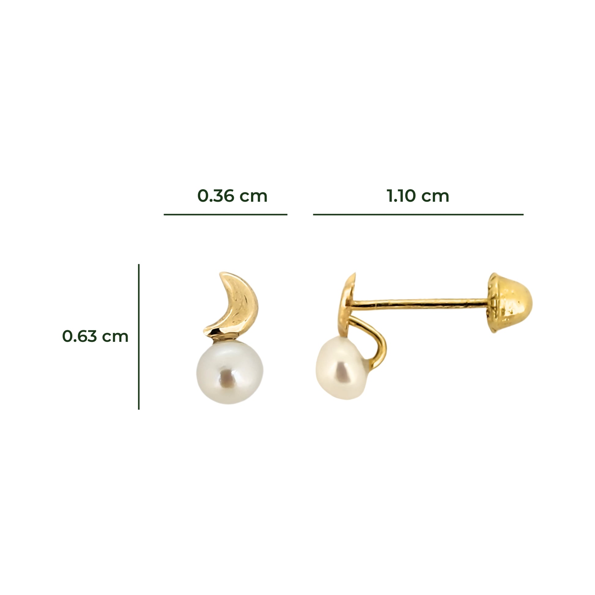 Elegante par de aretes en forma Luna con perla mini, en oro sólido de 10K. Arete tipo broquel.