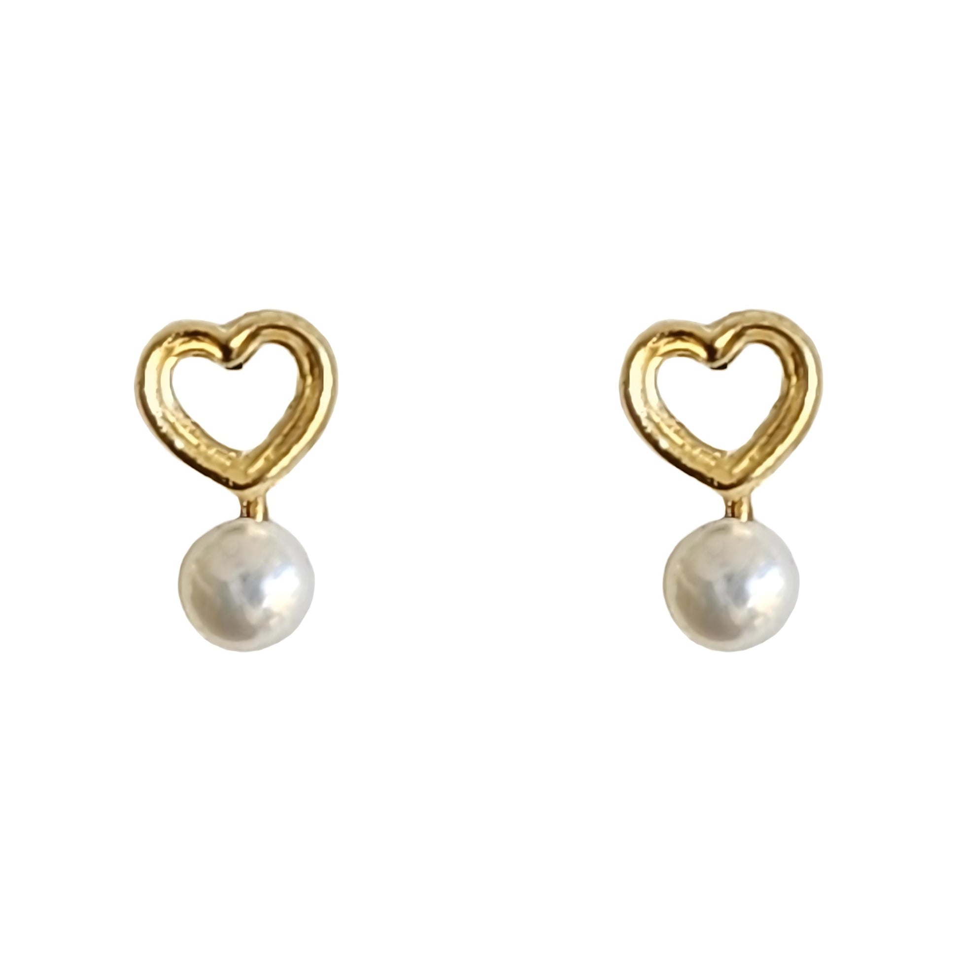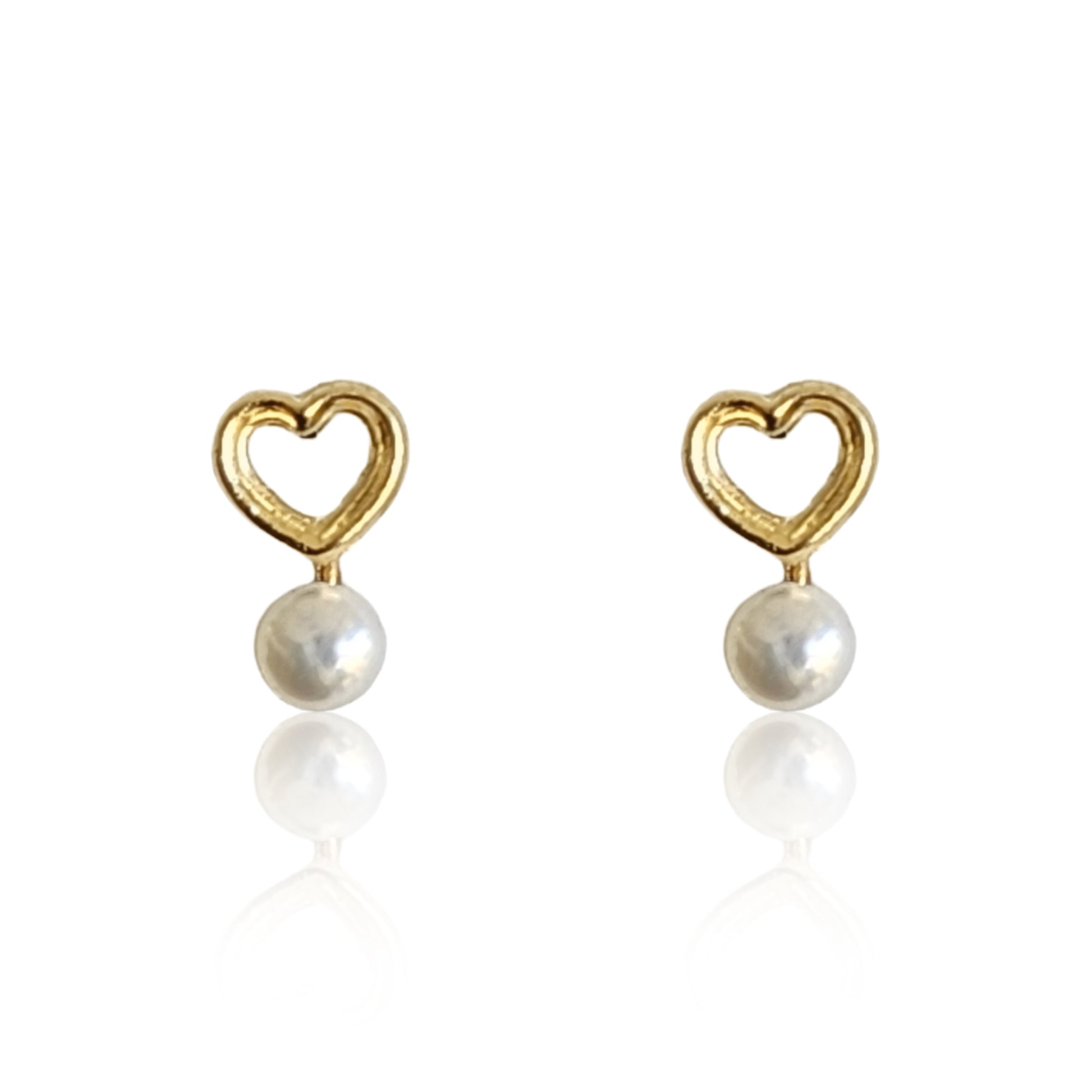 Elegantes aretes en forma de Corazón Silueta con Perla Mini, en oro sólido de 10K. Arete tipo broquel. Perfecto para segundas perforaciones.