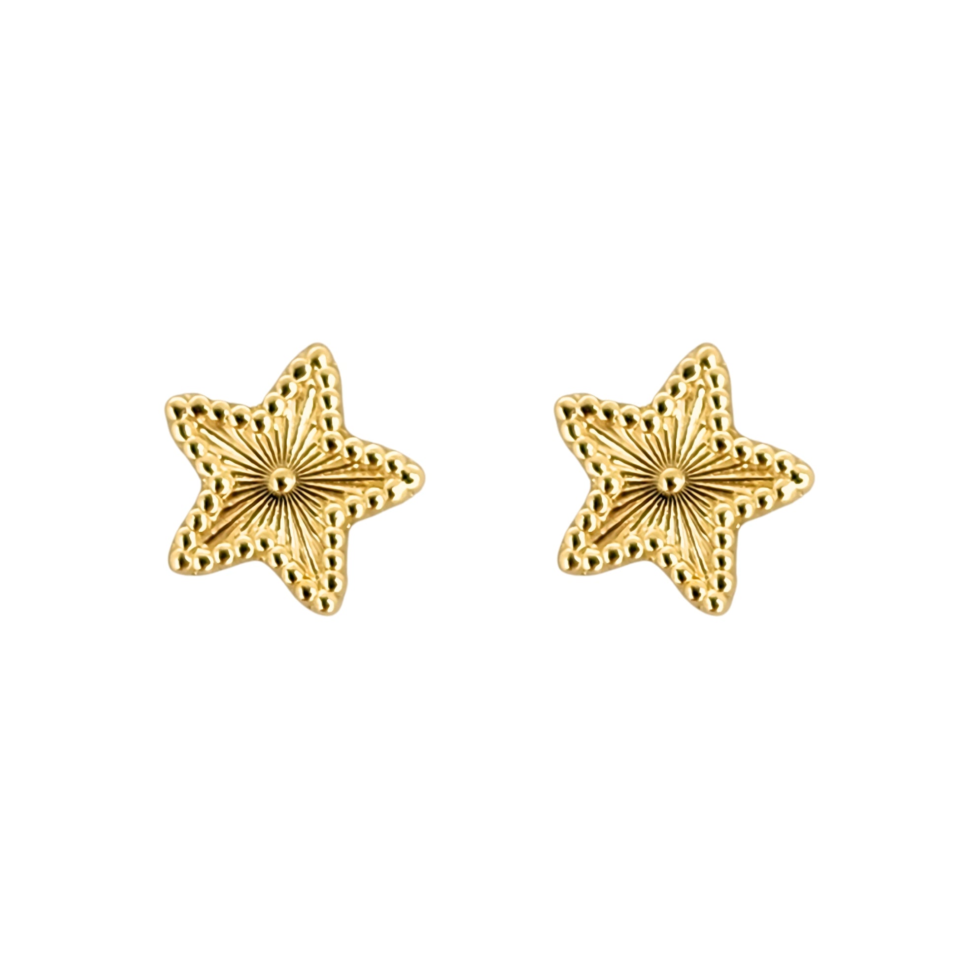 Elegantes aretes en forma de Estrella Rayada, en oro sólido de 10K. Arete tipo broquel. Perfecto para segundas perforaciones.